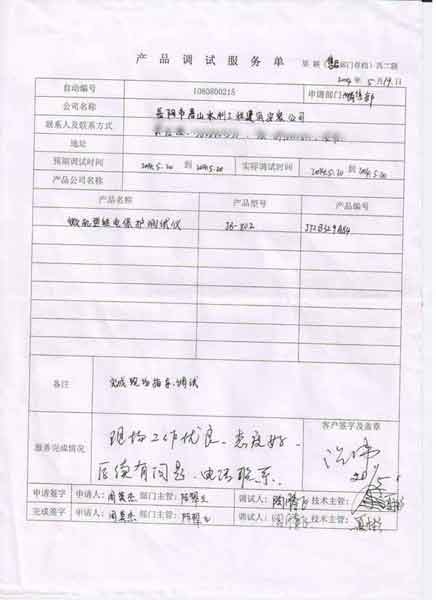 2014-05-20 岳陽市君山水利工程建筑安裝公司進行調試服務,調試產品:CYJB-802 微機型繼電保護測試儀
