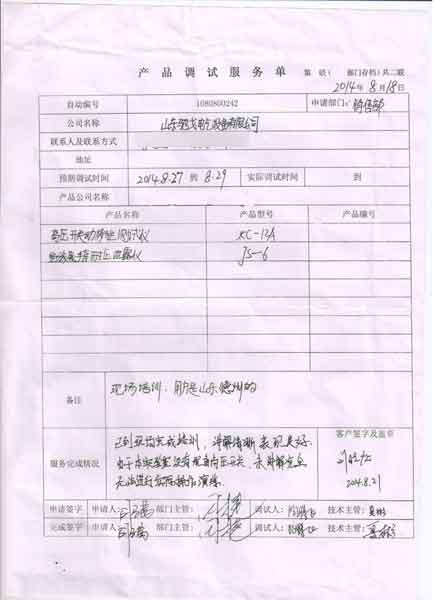 2014-08-21 山東馳戈電氣設備有限公司進行調試服務,調試產品:CYKC-12A 高壓開關動特性測試儀 CYJS-6A 絕緣靴手套耐壓泄露儀